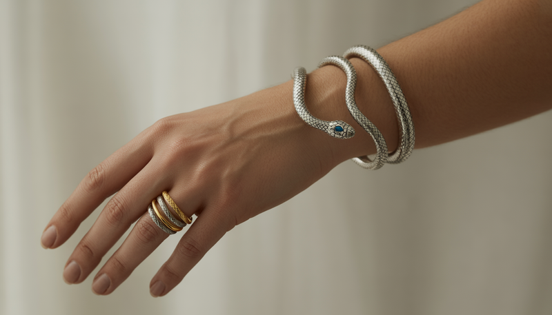 | Minimalisme urbain | Superposition délicate d’anneaux fins | Bracelet serpent imposant équilibré par plusieurs bagues fines |